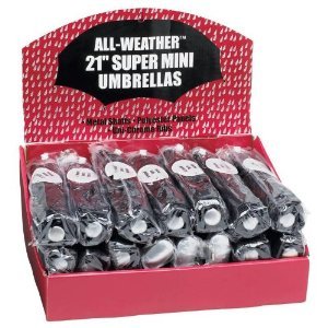 These super-mini umbrellas feature uni-chrome ribs, black closing straps, silver tone straight handles and end caps, wrist straps for easy toting, and clear storage pouch. Display measures 12-1/2" x 5-1/2rdquo x 9-1/2rdquo. Not sold individually.