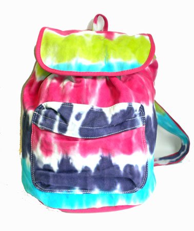 Send your child off to school in style with this fun and fashionable backpack. Made of high quality durable materials with a groovy tye dye pattern in pink, purple and green.Features include: A front zipppered storage pocket, a roomy interior, and a drawstring top with a velcro flap closure.Also features adjustable shoulder straps and a hanging loop. Awesome!