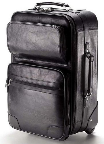 Wheeled Leather Carry-on. Main body unzips to packing room with elastic security straps and full size mesh pocket. Front top zipper compartment with large gusset. Bottom zipper compartment opens to accordion style pocket with two separate sections. Front zipper pocket for papers and tickets. Top and side handles. Protective side feet. telescopic handle extends to 41" and features blade wheels. The #97553 is the companion piece to the #1186; the 1184 is the 19" version of the #1186. Measures 14.5" x 21" x 9.5". By Clava.