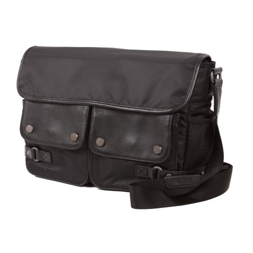 - Messenger bag with large zippered compartment under magnetic flap and two leather flap pockets on magnetic snap closure. Fits up to a 13 laptop screen